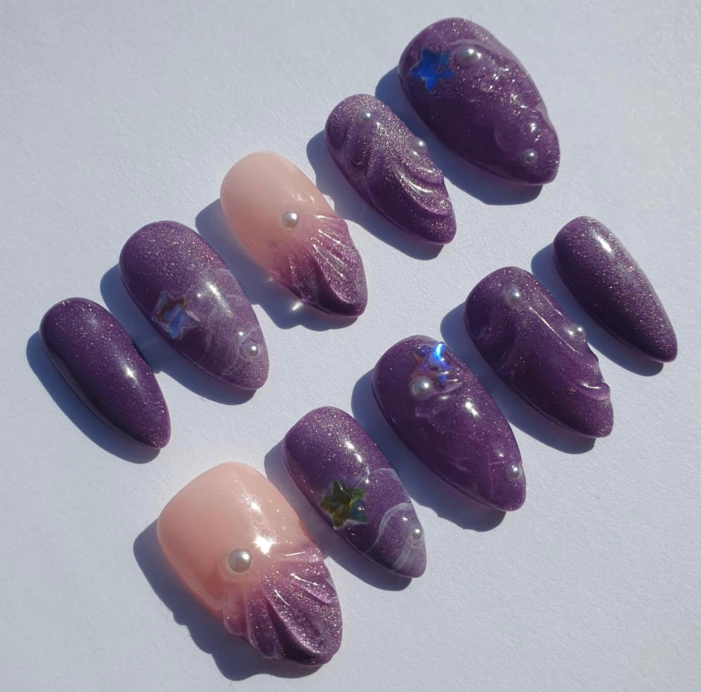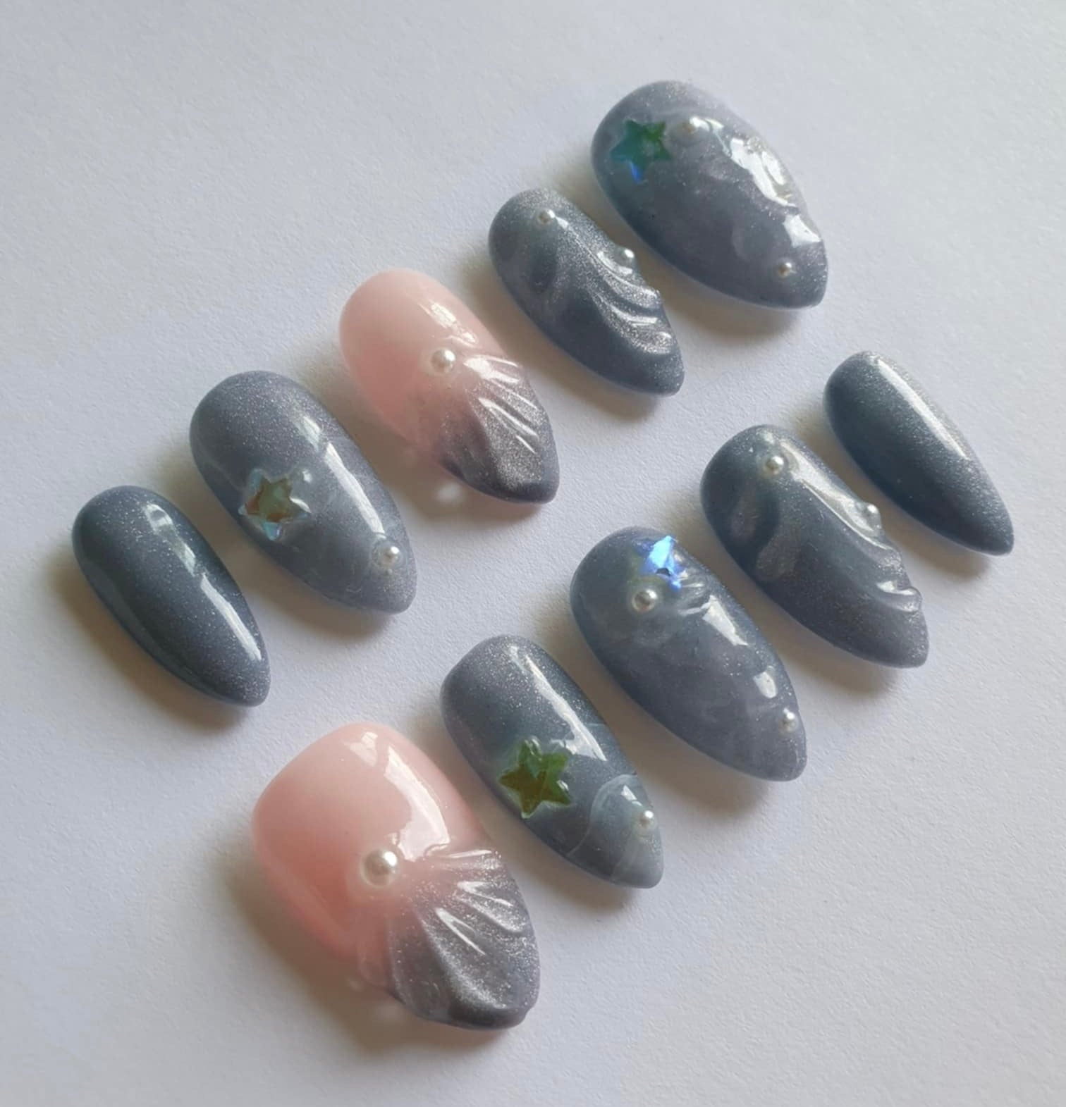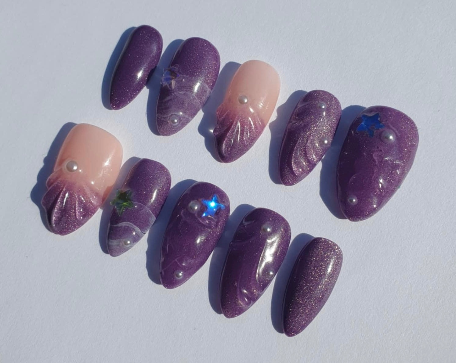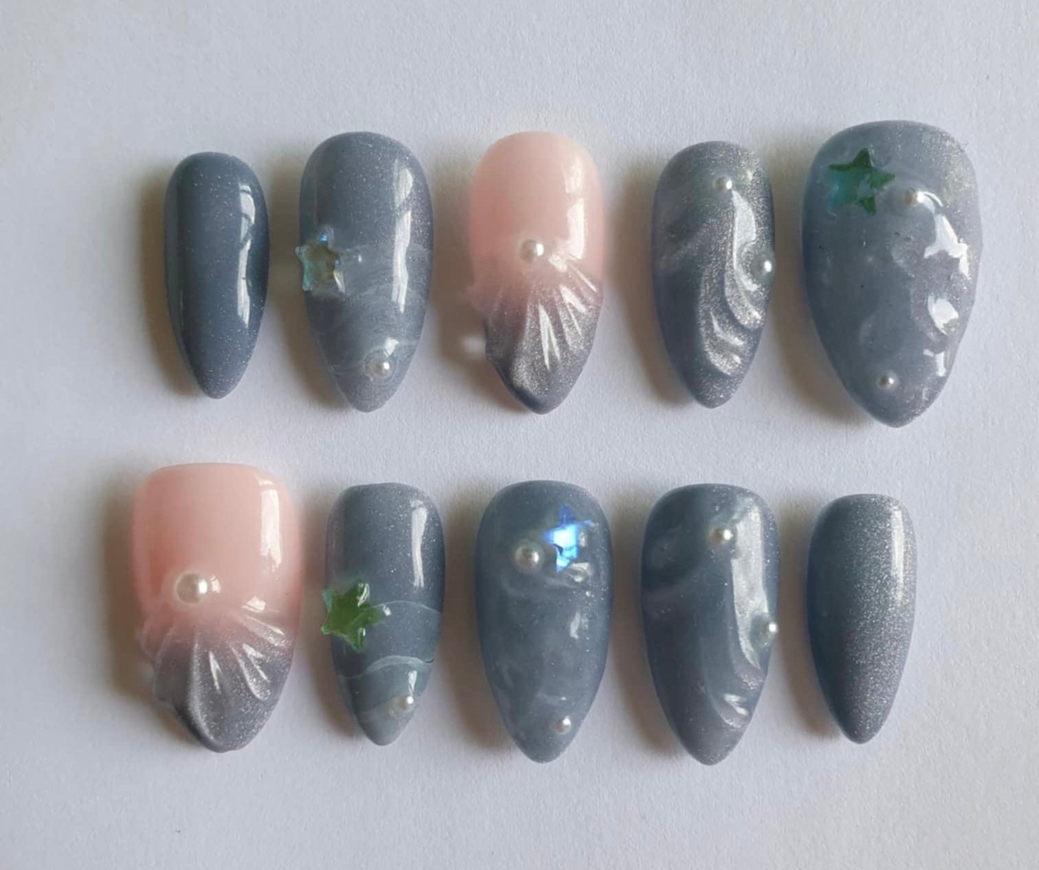 Transform your look with Ocean Metamorphosis press-on nails! Experience the beauty and power of the ocean with these stunning, easy-to-apply nails. Perfect for adding a touch of mermaid magic to any occasion. Dive into a new level of style with Ocean Metamorphosis press-on nails.
